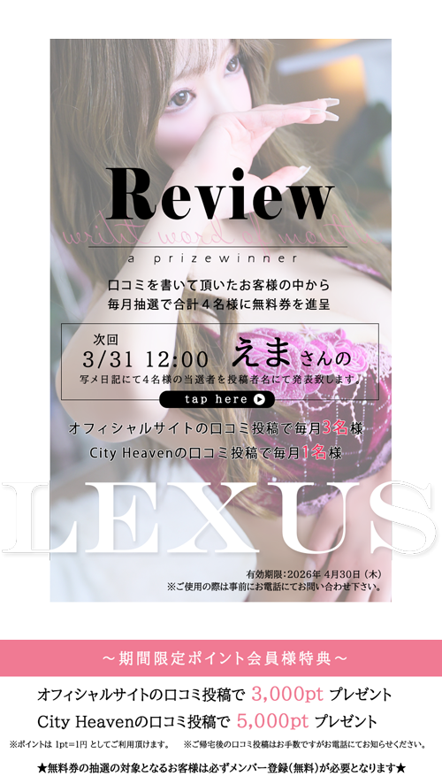 素晴らしい接客、素晴らしいサービス、いつもいつも大変ありがとうございます。なかなか忙しいため頻繁にはこれませんが毎回指名させていただきます。次回お会いできる日を楽しみにしております。ありがとうございました。